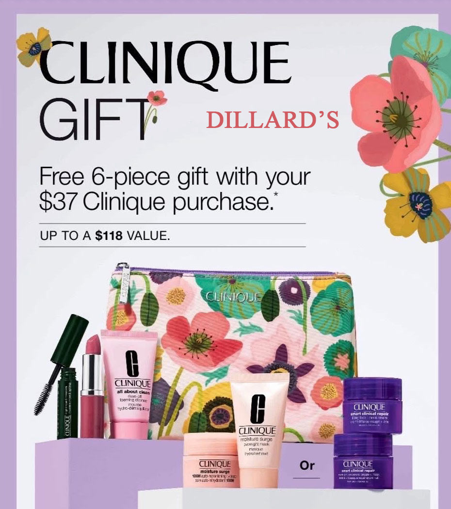 While supplies last, there is a new Clinique bonus time at Dillard’s. Receive a free 6-piece Clinique gift – yours with any $37 purchase. An $86 value.