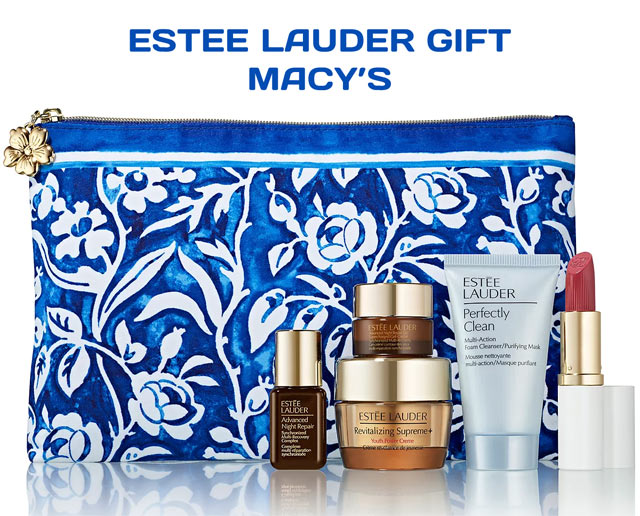 Choose your free 6-piece Estee Lauder gift with purchase at Macy’s online and in stores, while supplies last. Yours FREE with any $45 Estee Lauder order. Up to a $165 value.