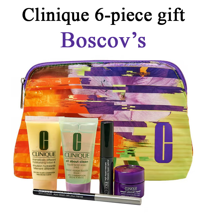 There is a Clinique bonus at Boscov’s. Online only. With any $40+ Clinique purchase, receive a FREE 6-piece gift. A $79 value.